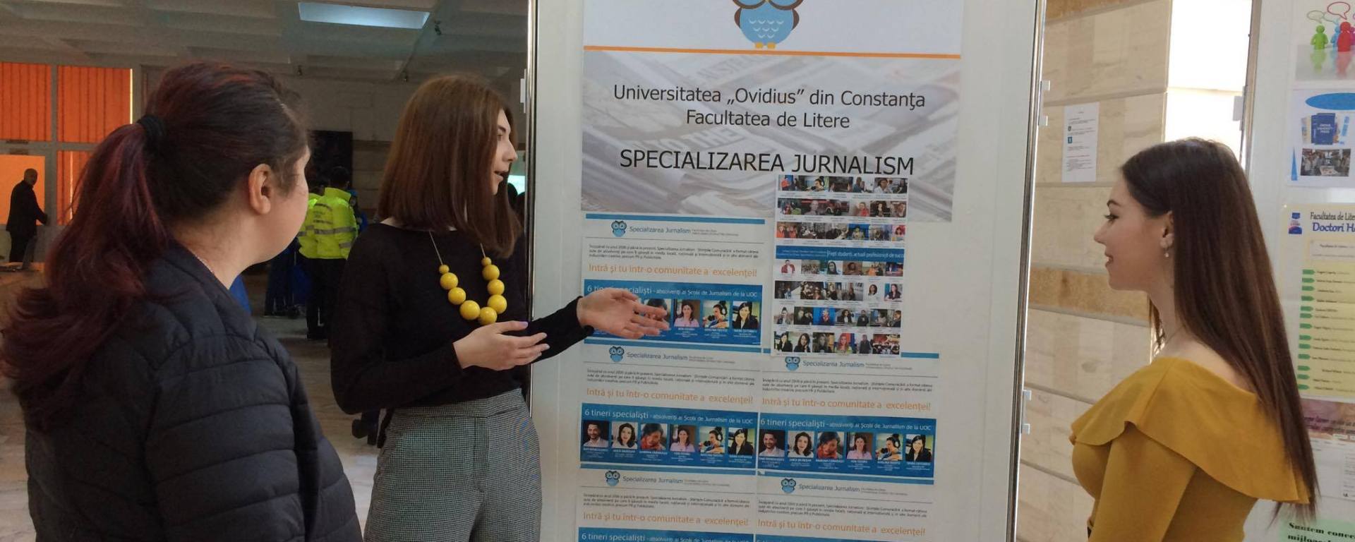 Studenţii la Jurnalism din cadrul Facultăţii de Litere a UOC, prezenţi la standul specializării, au oferit, alături de profesorii lor, toate informaţiile de care au nevoie liceenii interesaţi de o carieră în mass-media, fie că este vorba despre presa scrisă, despre jurnalism online, fie despre radio, televiziune, marketing şi PR.