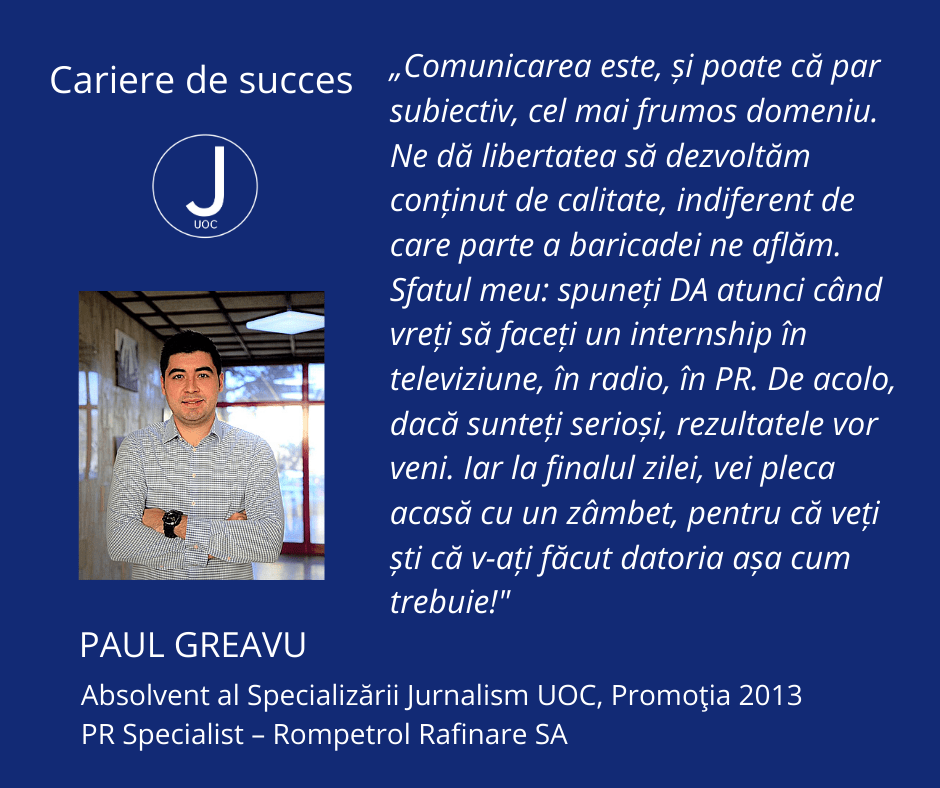 În cariera pe care o urmăm, mereu trebuie să dați curs oportunităților! În urmă cu mai bine de 6 ani, îmi începeam drumul în televiziune, la Digi24. Au fost aproape 5 ani în care am învățat noțiuni din toate domeniile: politic, cultură, turism sau energie. În momentul în care a apărut ocazia să fac parte din echipa Rompetrol, nu am ezitat, lucru pe care vi-l recomand: nu ezitați să spuneți DA noilor provocări!