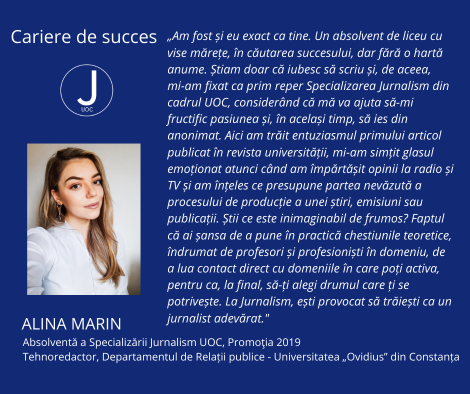 Alina Marin, absolventă a Specializării Jurnalism UOC, promoția 2016-2019, tehnoredactor, Departamentul de Relații publice – Universitatea „Ovidius” din Constanța