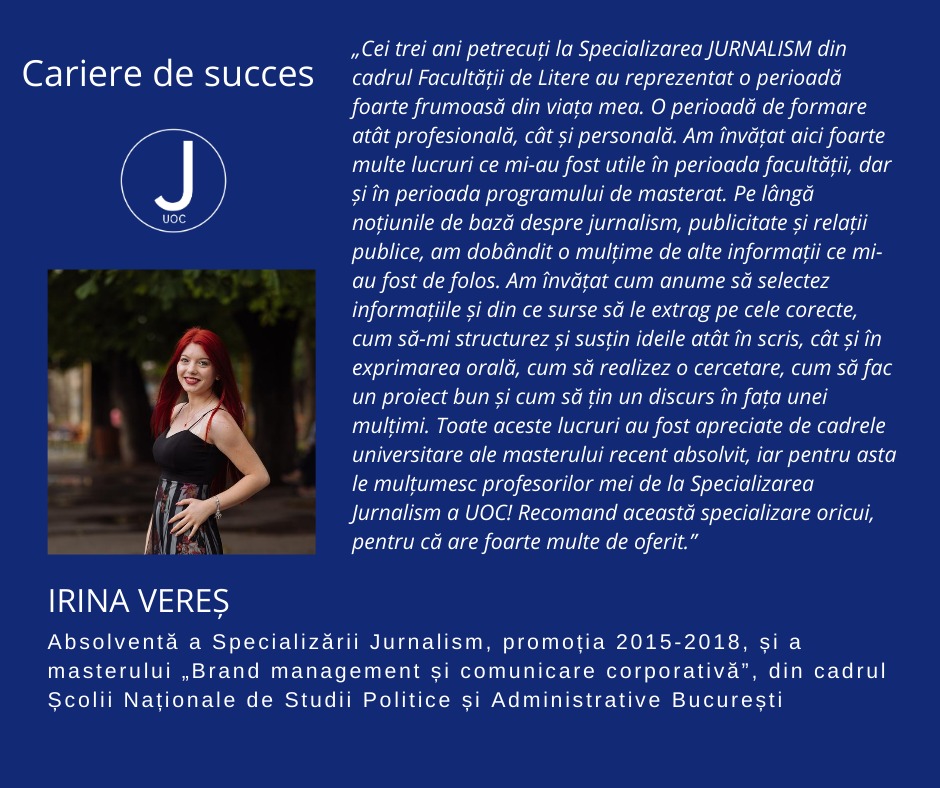 Irina Vereș, absolventă a Specializării Jurnalism, promoția 2015-2018, și a masterului „Brand management și comunicare corporativă”, din cadrul Școlii Naționale de Studii Politice și Administrative București