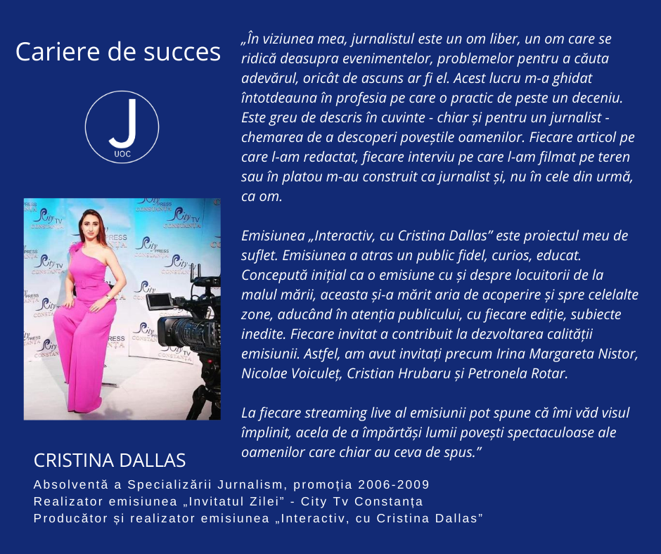 Cristina DALLAS, absolventă a Specializării Jurnalism, promoția 2006-2009, realizator emisiunea „Invitatul Zilei” – City Tv Constanța, producător și realizator emisiunea „Interactiv, cu Cristina Dallas”:
