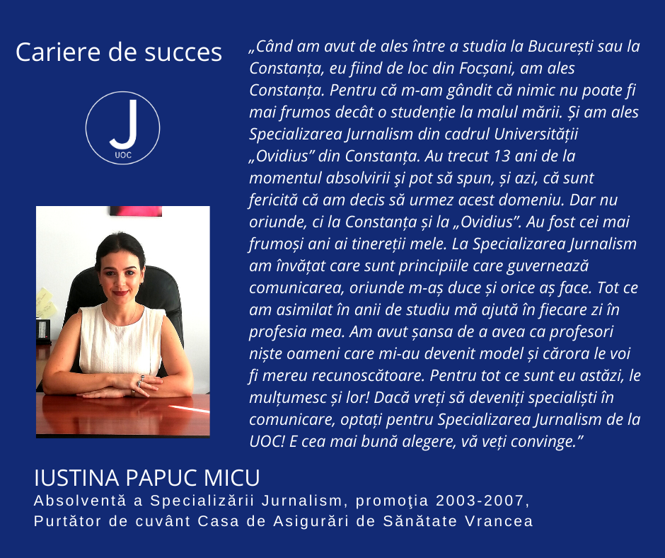 Iustina Papuc Micu, absolventă a Specializării Jurnalism, promoția 2003-2007, purtător de cuvânt Casa de Asigurări de Sănătate Vrancea