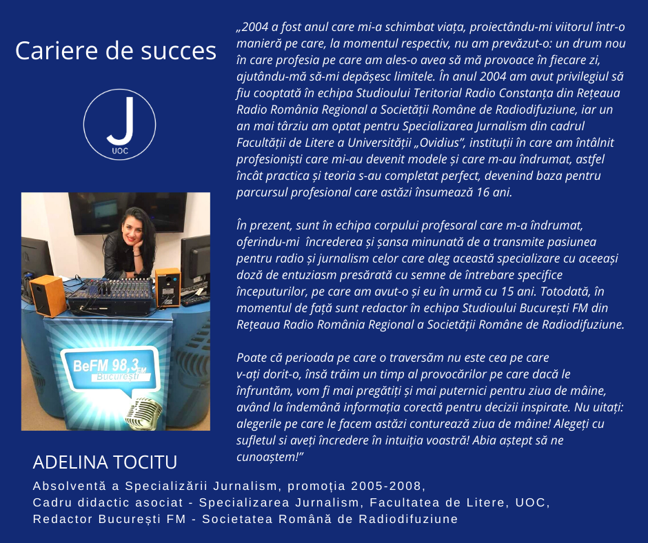 Adelina TOCITU, absolventă a Specializării Jurnalism, promoția 2005-2008, cadru didactic asociat – Specializarea Jurnalism, Facultatea de Litere, UOC -, redactor București FM – Societatea Română de Radiodifuziune