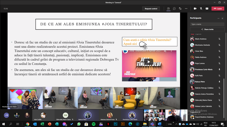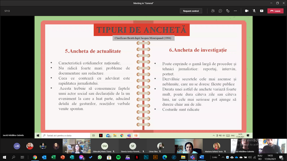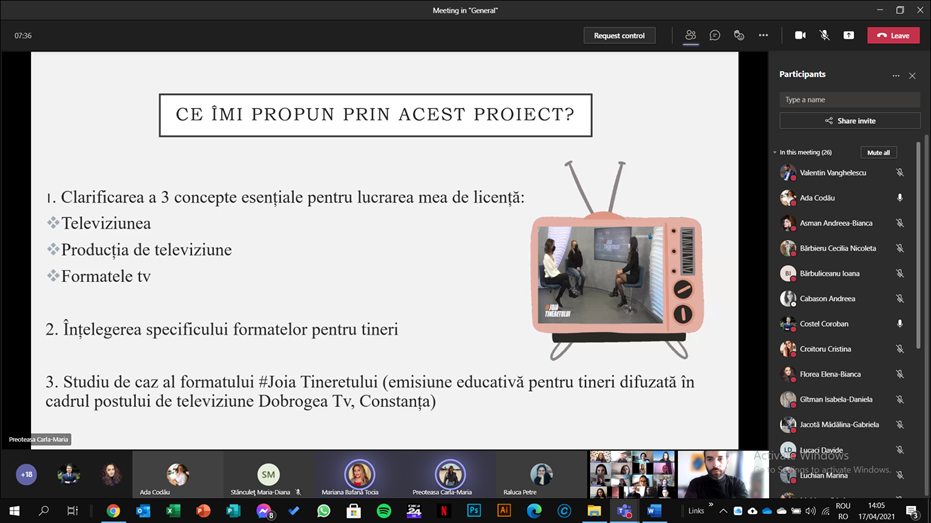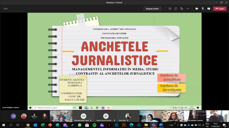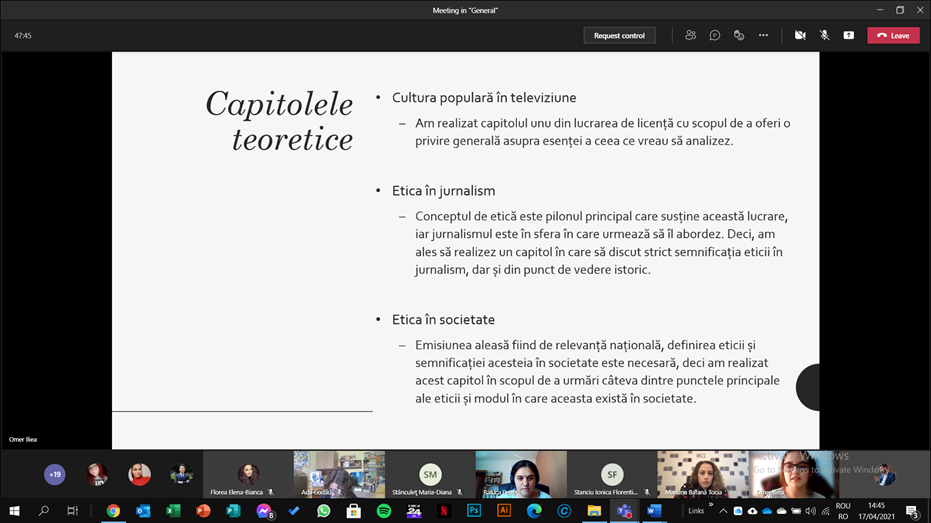 Mădălina Jacotă a prezentat, în cadrul sesiunii de comunicări, lucrarea „Managementul informației în media. Studiu contrastiv al anchetelor jurnalistice” prin care își propune analizarea comparativă a anchetelor jurnalistice publicate de Rise Project și de cotidianul local Replica de Constanța. În ceea ce o privește pe Marina Luchian, studenta în anul IIIlucrează la cercetarea „Criza din Belarus. Contextul geopolitic şi mediatizarea acesteia în presa românească”, în care analizează mediatizarea conflictului din Belarus în presa românească, dar nu numai, mai exact, în textele de opinie, pentru a înțelege poziționarea jurnaliștilor față de subiect.