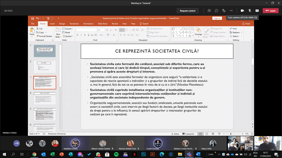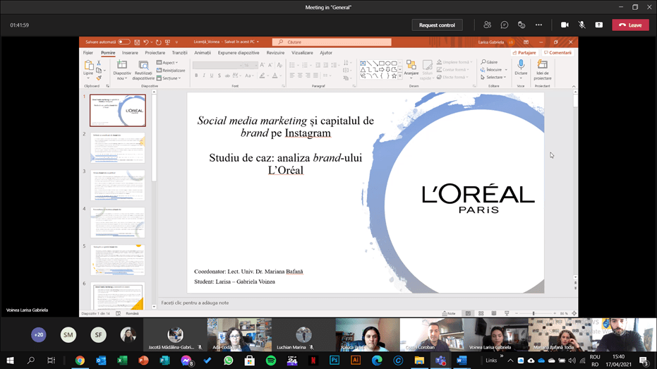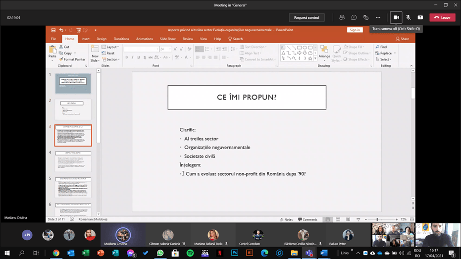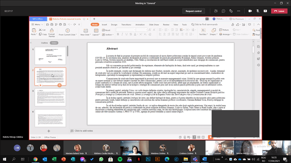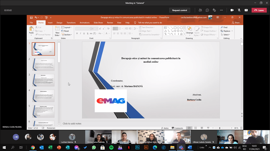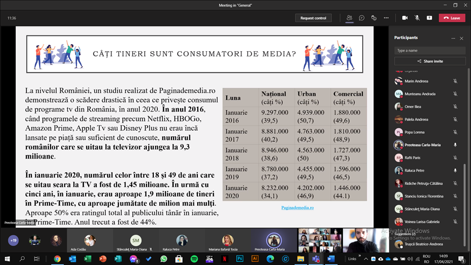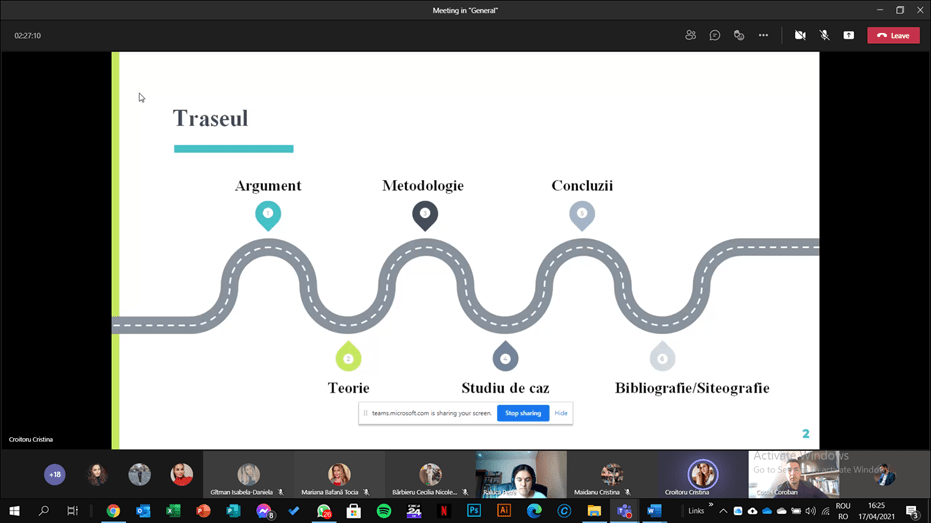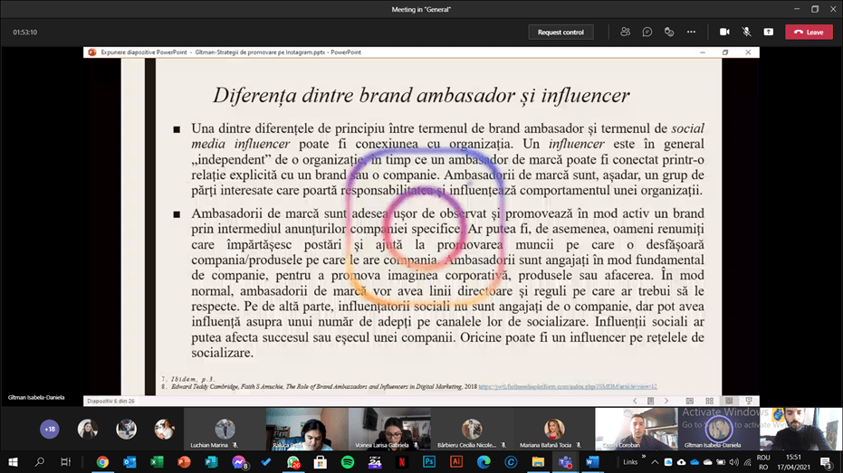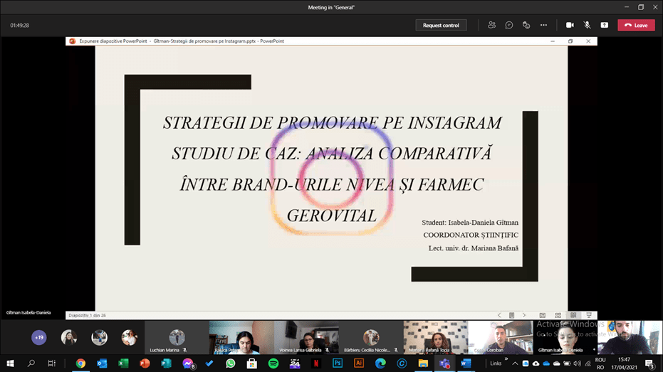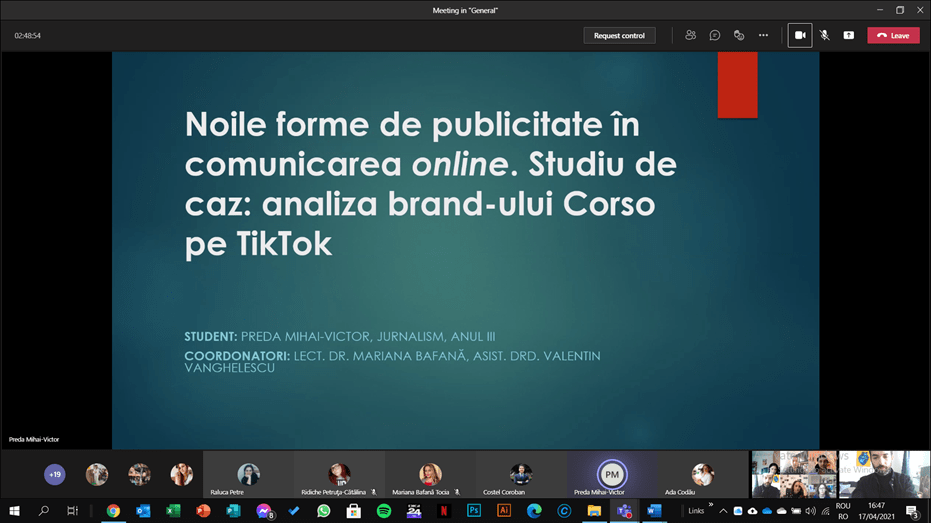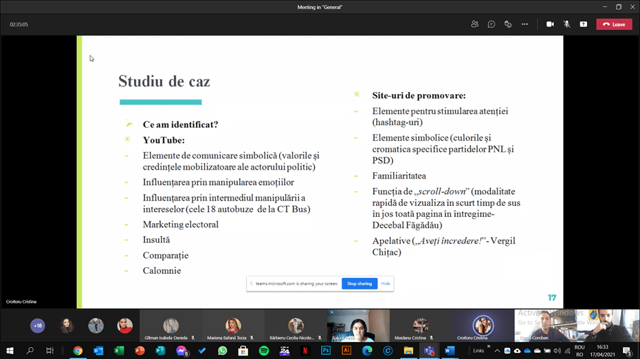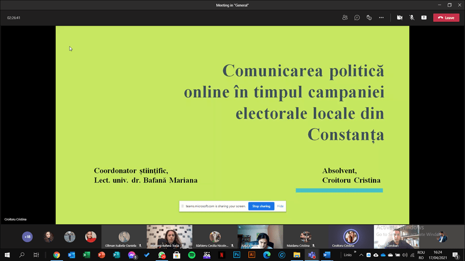 Cristina Croitoru abordează, în cercetarea sa – „Comunicarea politică online în timpul campaniei electorale locale din Constanța”, – aspecte precum limbajul, abaterile de la normele etice și discursurile de atac între trei politicieni, foști candidați la alegerile locale din 2020, din Constanța. Studenta își propune să înțeleagă dacă cei trei au avut sau nu o comunicare politică bună și, în acest scop, pune sub lupă comunicarea acestora pe canalele de YouTube, pe site-urile lor, precum și pe platformele de socializare (Facebook și Instagram). Petruța Ridiche a prezentat, în contextul evenimentului, lucrarea „Analiza comunicării politice în timpul crizei provocate de pandemia Covid 19”, în care studiază modul de comunicare al unor politicieni români în timpul crizei provocate de pandemia COVID 19.