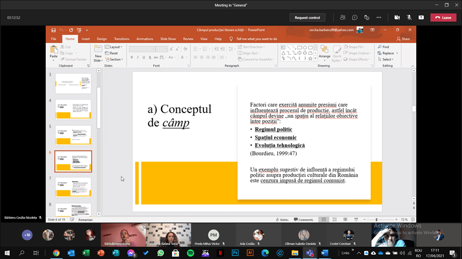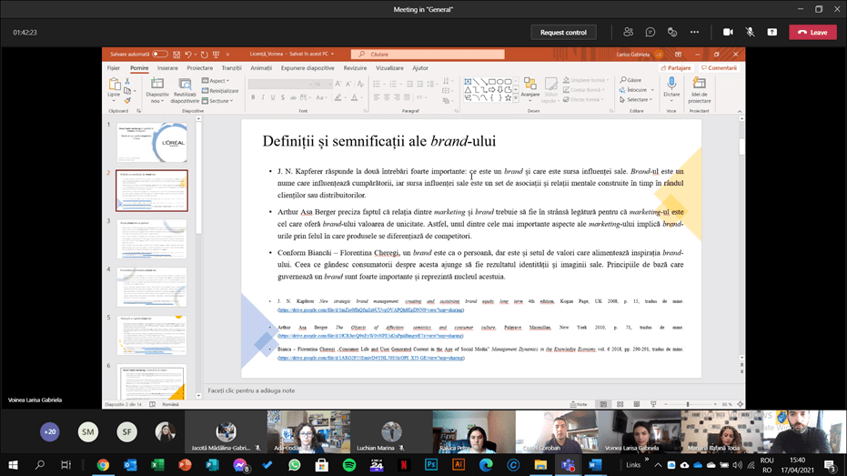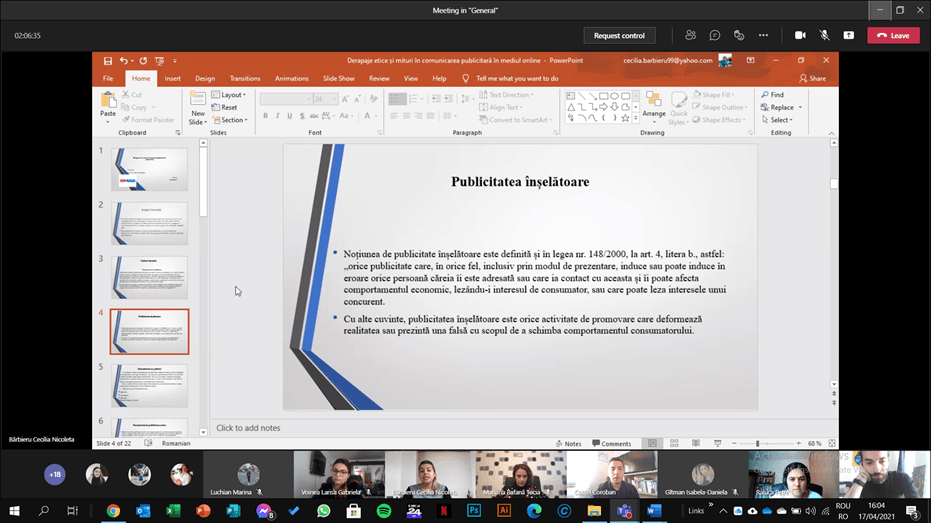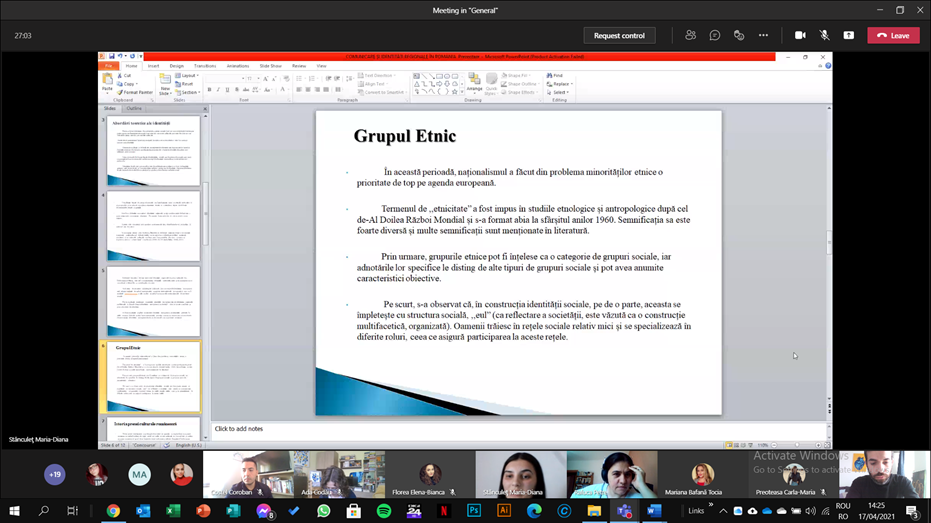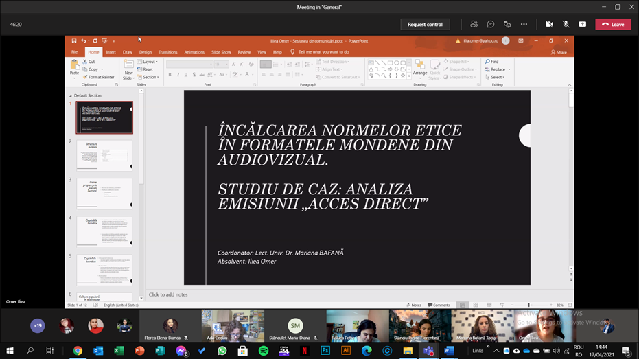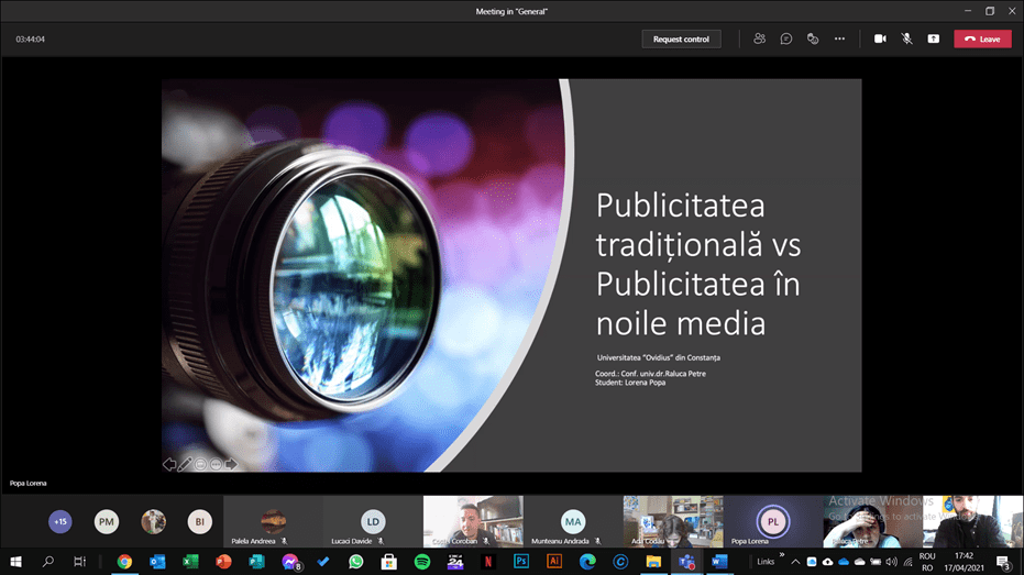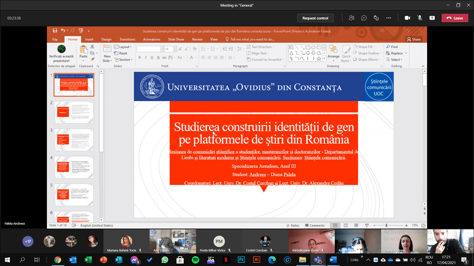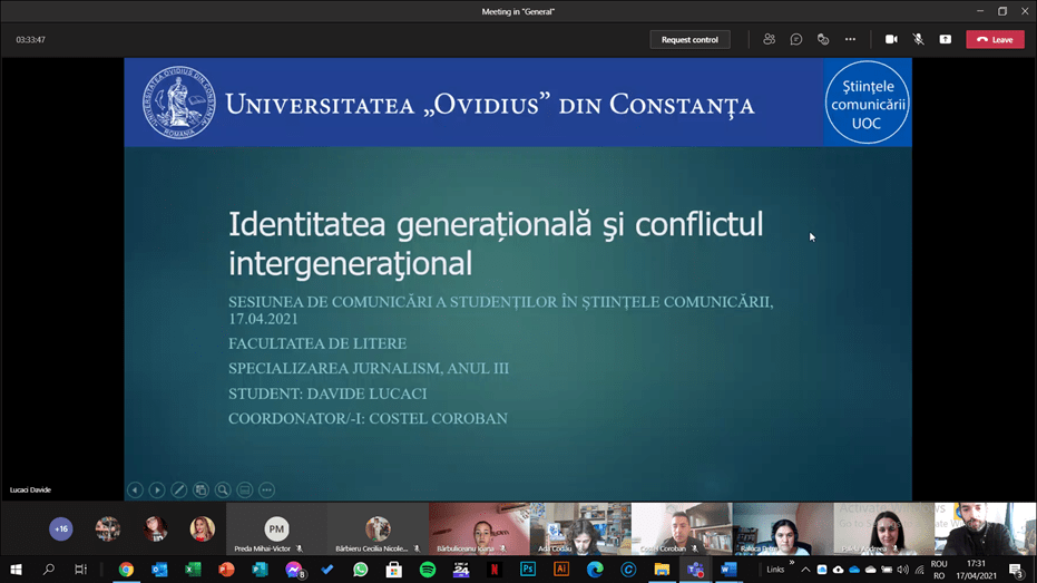 Departamentul de Limbi și literaturi moderne și Științele comunicării din cadrul Facultății de Litere a Universității „Ovidius” din Constanța (UOC) a organizat, la finalul săptămânii trecute, o nouă ediție a Sesiunii de comunicări științifice a studenților, masteranzilor și doctoranzilor. La fel ca și anul trecut, dat fiind contextul pandemiei de coronavirus și restricțiile impuse, manifestarea științifică s-a desfășurat în regim online, pe platforma Microsoft Teams. Evenimentul este o tradiție atât pentru studenții, cât și pentru profesorii de la Științele comunicării din cadrul UOC și reprezintă un context oportun pentru transferul de cunoaștere și schimbul de idei, pentru dezbateri pe marginea temelor de actualitate din domeniu, precum și pentru exersarea gândirii critice de către viitorii absolvenți, care își doresc să își construiască o carieră în această zonă.