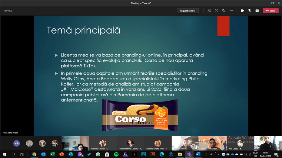 Nu în ultimul rând, Mihai Preda a prezentat, în cadrul panelului „Comunicare și promovare”, cercetarea „Noile forme de publicitate în comunicarea online. Studiu de caz: Analiza brand-ului Corso pe TikTok” în care a analizat principalele tendințe ale branding-ului online, scopul său fiind observarea adaptabilității brand-urilor la noile platforme.