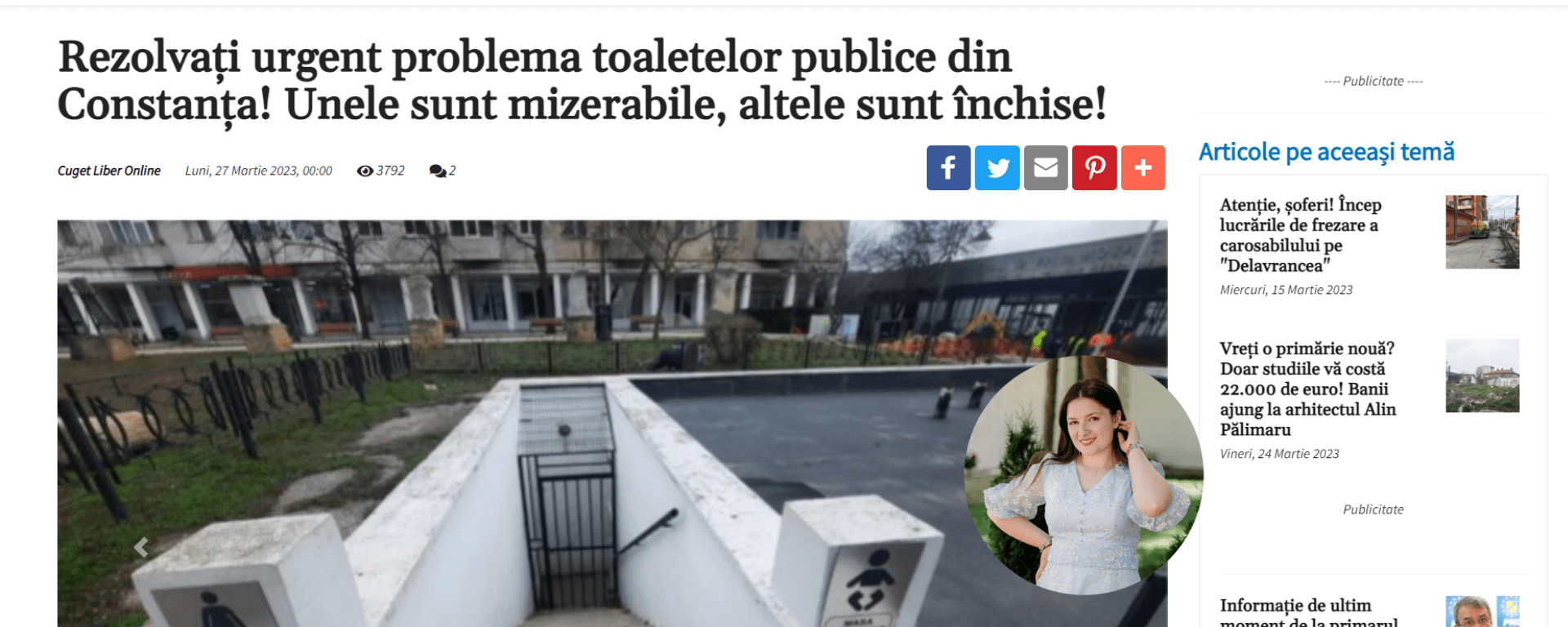 Stagiul de practică de specialitate a studenților Specializării Jurnalism din cadrul Facultății de Litere a Universității Ovidius din Constanța la cotidianul „Cuget liber” continuă. După debutul colegelor mele, Delia Dascălu și Alexandra Marin, a venit rândul meu să scriu în presa locală. Am publicat, recent, un text despre una dintre problemele Constanței și anume lipsa igienei din toaletele publice din municipiu, iar asta pentru că mă preocupă diverse aspecte ce țin de administrarea orașului.