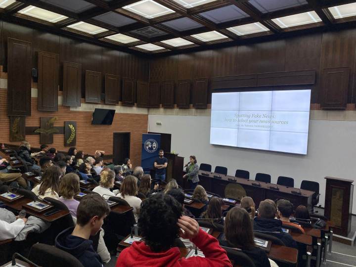 Lect. univ. dr. Valentin Vanghelescu de la Specializarea Jurnalism din cadrul Facultății de Litere a Universității Ovidius din Constanța (UOC) a susținut, recent, workshop-ul „Spotting fake news: how to select your news sources”, eveniment la care au participat aproximativ 80 de elevi și profesori de la Colegiul Național „Mircea cel Bătrân” din Constanța, dar și din licee din străinătate: Kurt-Tucholsky-Oberschule Berlin, Mediencollege Berlin, Istituto di Istruzione Superiore „Leonardo da Vinci” Carate Brianza şi Istituto d’Istruzione Superiore „G. B. Vaccarini” Catania. Trebuie menționat că liceenii constănțeni și liceenii de peste hotare au ajuns împreună în acest context datorită programului Erasmus+ și, mai exact, prin intermediul proiectului „Falsamente vero”, proiect sub egida căruia s-a desfășurat, de altfel, în Sala Senatului a UOC, și evenimentul susținut de lect. univ. dr. Valentin Vanghelescu.