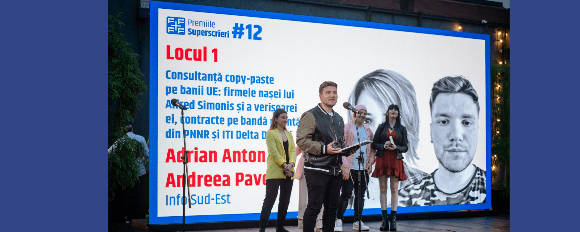 Adrian ANTON, student în anul II la Specializarea JURNALISM din cadrul Facultății de LITERE a Universității OVIDIUS din Constanța, a obținut, la Gala Superscrieri, desfășurată în această seară, locul I, la categoria „Presă locală”, pentru investigația „Consultanță copy-paste pe banii UE: Firmele nașei lui Alfred Simonis și a verișoarei ei, contracte pe bandă rulandă”, investigație semnată alături de jurnalista Andreea Pavel, în publicația Info Sud-Est.