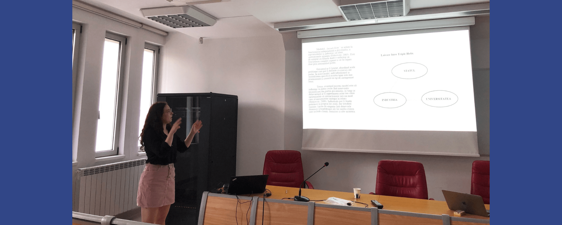 La Sesiunea de comunicări științifice sudențești, eu am prezentat lucrarea „Comunicare intersectorială și sustenabilitate. Modelul Triple Helix în sectorul public din Dobrogea”, îndrumată de conf. univ. dr. Raluca Petre. Disertația mea face parte dintr-un proiect mai amplu – realizat într-un cadru colaborativ cu Western Norway University – de înțelegere a modelului de dezvoltare din regiunea Sud-Est România, respectiv Vest Norvegia. Colegii mei implicați în proiect, care au realizat interviuri în cadrul acestei cercetări sunt: Bianca-Maria Ciurea, Ekaterina-Andreea Chițu, Alexandru Tudor, Adrian Anton, cu toțiicoordonați de conf. univ. dr. Raluca Petre. Rezultatele cercetării au fost că fiecare sector (sectorul public, sectorul privat și domeniul universitar) operează individual, astfel că statul, firmele și universitatea sunt separate, fiecare își vede de sfera sa instituțională, având o comunicare fragmentată, de tipul „laiseez-faire”. De asemenea, am descoperit că birocrația reprezintă cel mai mare impediment, care stă în calea implementării multor proiecte, potrivit celor din sectorul public care au răspuns la interviu.