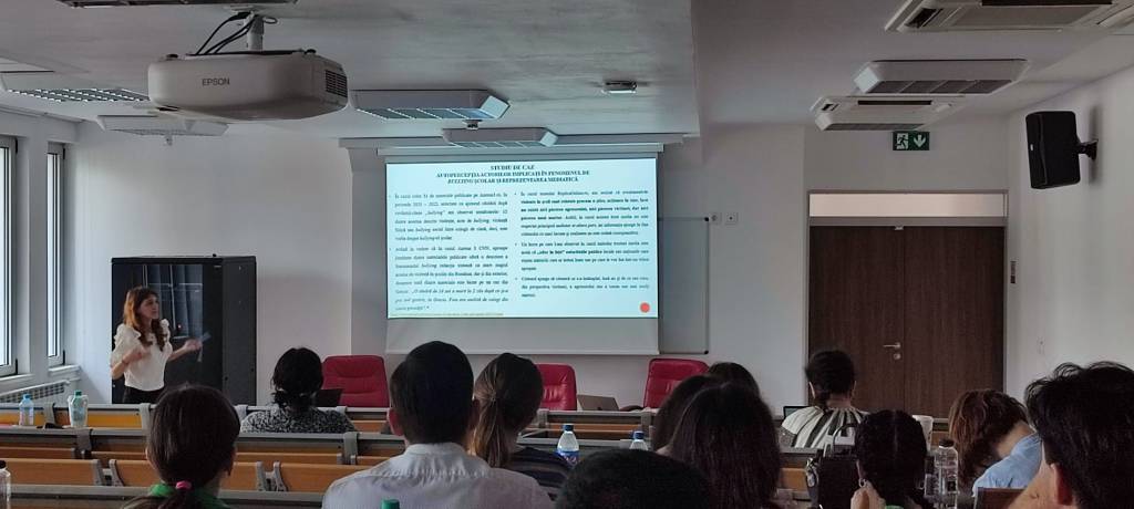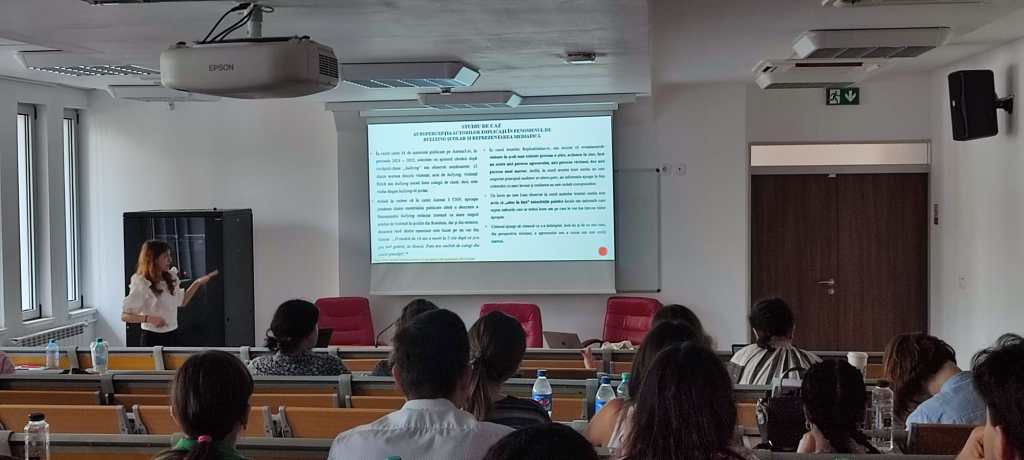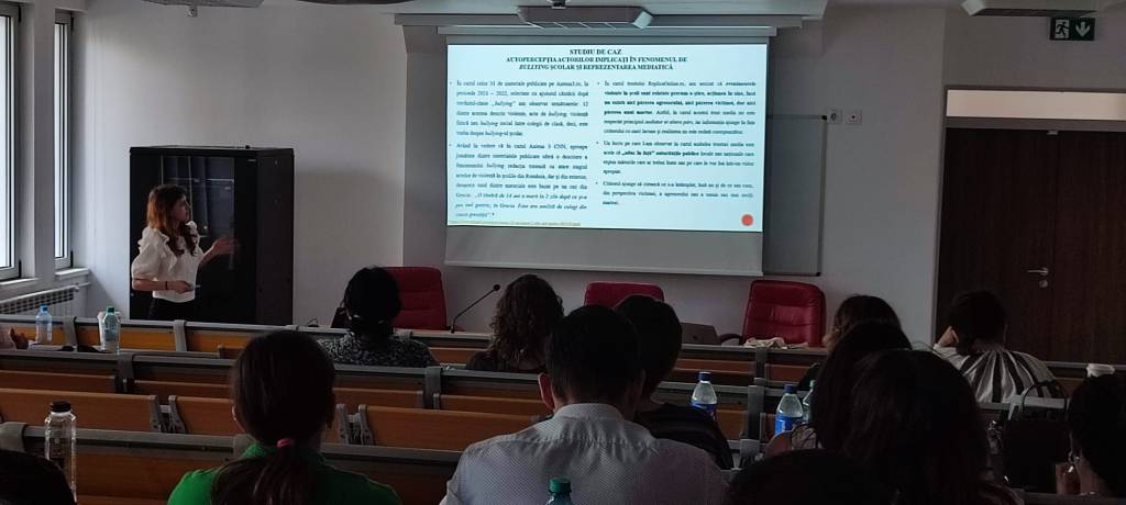 Și lucrarea Andreei Chițu, colega mea de la Universitatea Ovidius din Constanța, a avut o lucrare impresionantă: „Bullying școlar – fenomen social și reprezentare media”, coordonată de conf. univ. dr. Raluca Petre de la Științe ale comunicării UOC. Ce a descoperit Andreea prin cercetarea sa este faptul că mass-media tratează problema bullying-ului școlar ca o știre de tip eveniment, menționând doar ce s-a întâmplat, neincluzând, însă, și vocile tuturor persoanelor implicate sau ce anume a dus la o astfel de manifestare. Asta în condițiile în care victimele, agresorii și/sau martorii cu care a discutat studenta sunt de părere că media „oferă voce celor fără voce”. Andreea Chițu a mărturisit, la finalul sesiunii de comunicări, că deși a avut emoții, pentru ea, participarea la acest eveniment a fost un exercițiu bun înainte de susținerea lucrării de licență: „Emoțiile au venit buluc, alături de teama de a nu greși, Dar aceste emoții au dispărut când am finalizat de prezentat. Privirile celor prezenți îmi dădeau confirmarea că a fost bine, aplauzele au fost ca o ușurare pentru mine, mi-au dat de înțeles că am avut un subiect puternic. Aș repeta experiența și recomand acest exercițiu tuturor celor care au dificultăți în a vorbi în public sau urmează să prezinte, să susțină o lucrare”, a declarat Andreea Chițu.