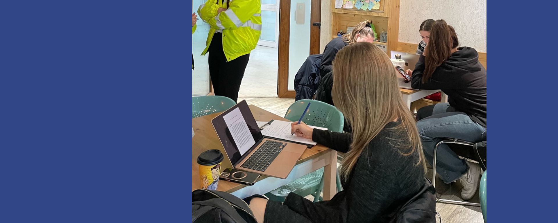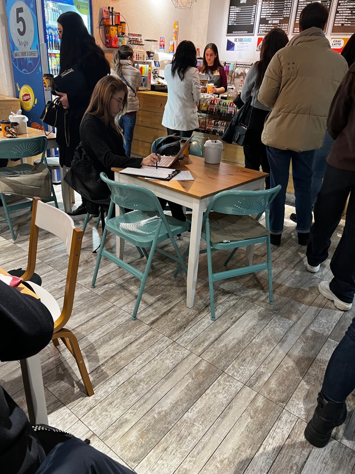 La cafenea, pe mese sunt etalate cărți și alte materiale de învățare. O fată studiază singură la o masă: „A ocupat masa degeaba!” (sesizează o studentă la Jurnalism). Deasupra meselor încărcate de cunoaștere, se poartă discuții înfocate… despre orice altceva. „La cât de tare vorbiți, vă auzim și noi!” (observație la cafenea).
