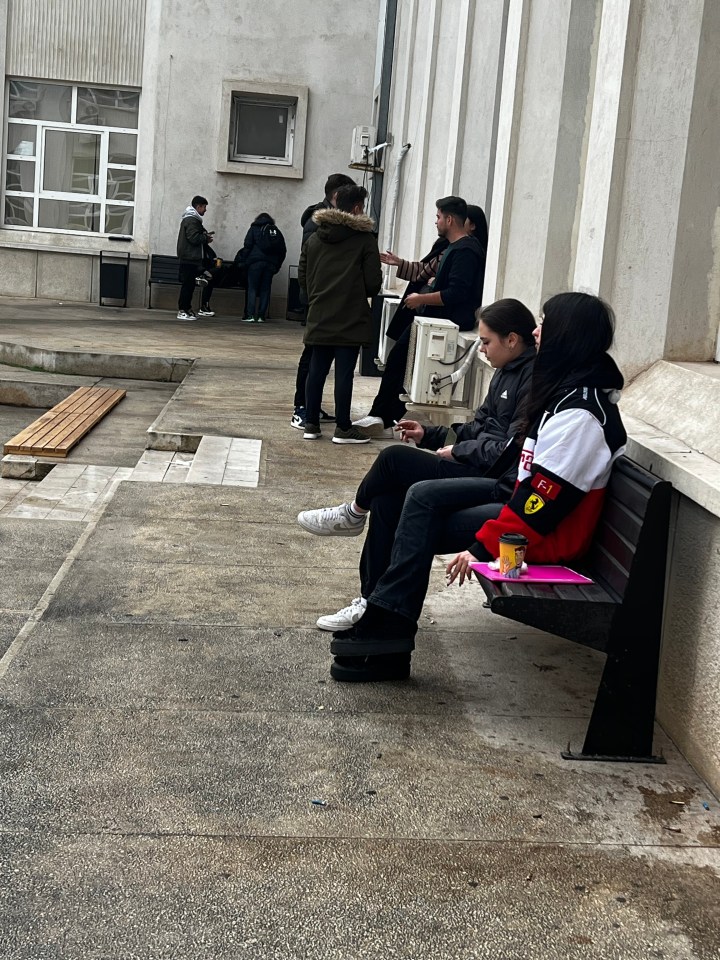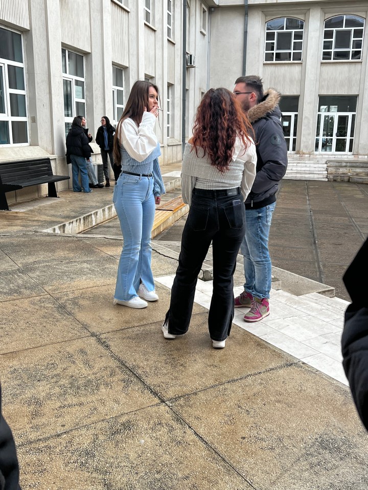 De la intrarea în Campus, unde este bradul cu fundă roșie, până la băncuțele din spatele clădirii, întâlnim studenți care mai de care mai alerți: „Aoleu, vedeți cât avem de învățat?” (curtea interioară).
