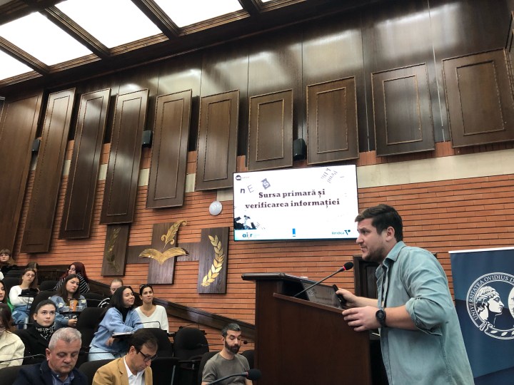 Jurnalistul Andrei Leonte a început prezentarea sa întrebându-i pe studenţii prezenţi la eveniment ce anume le trece prin minte atunci când aud fake news. Unul dintre răspunsuri s-a referit la ştirea falsă conform căreia Angelina Jolie și Elon Musk ar fi venit în România, mai exact la Castelul Bran, pentru o petrecere de Halloween, în 2022. Alte câteva exemple de ştiri false au fost cele privind moartea lui Florin Salam și a lui Vladimir Putin.