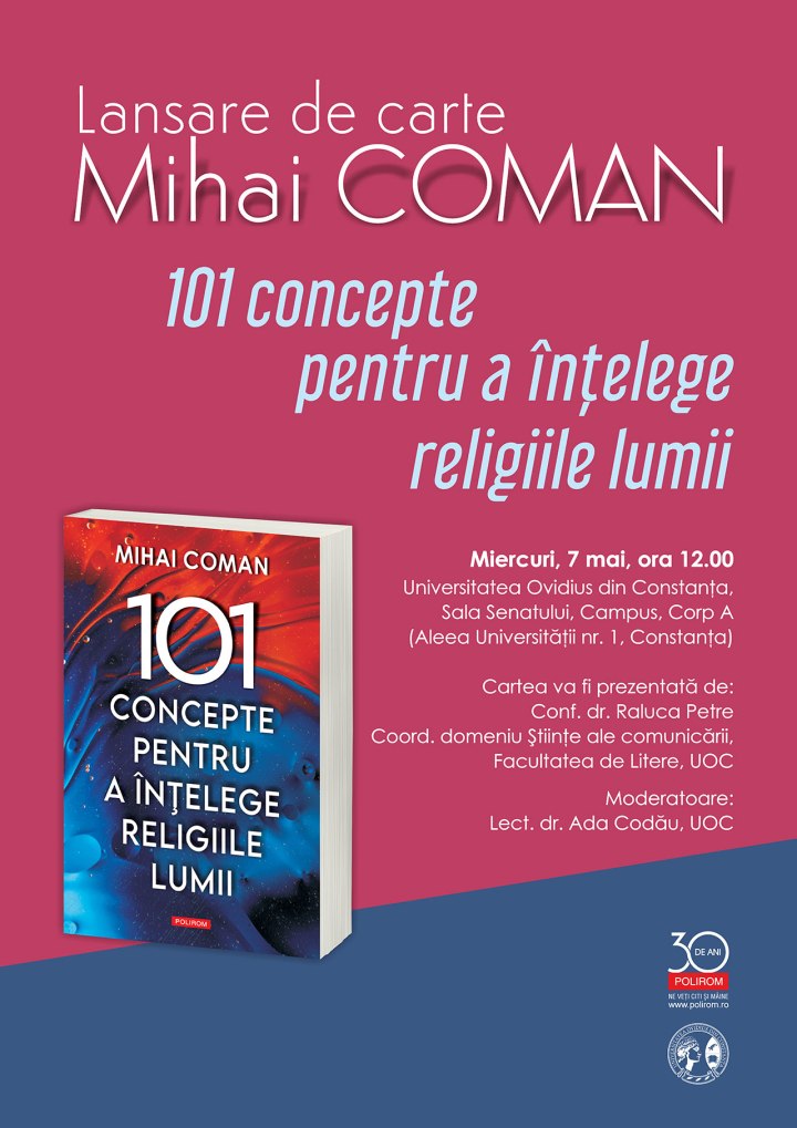 Facultatea de Litere, domeniul Științe ale comunicării din cadrul Universității Ovidius din Constanța (UOC) a găzduit miercuri, 7 mai 2025, lansarea volumului „101 concepte pentru a înțelege religiile lumii”, semnat de profesorul Mihai Coman, fondatorul învățământului universitar de jurnalism și comunicare din România. Cartea a fost prezentată de conf. univ. dr. Raluca Petre, coordonatoarea domeniului Științe ale comunicării de la UOC, lansarea lucrării fiind moderată de lect. univ. dr. Ada Codău.