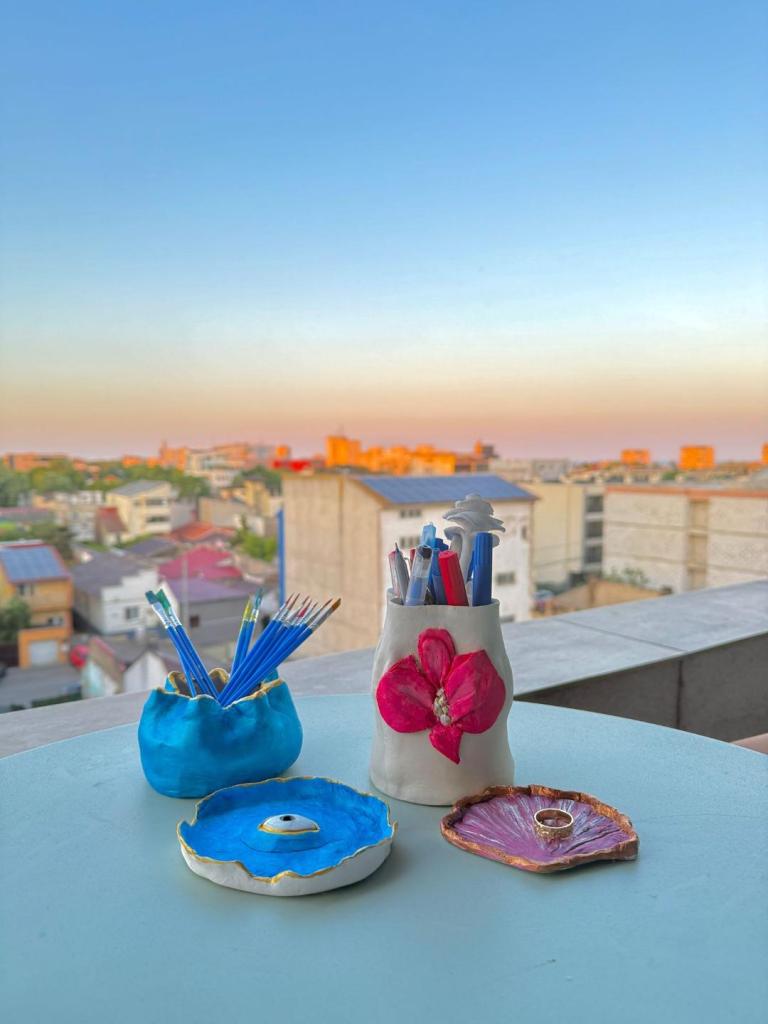 Livia Dafa, originară din Albania, este studentă în anul I la Jurnalism. În urmă cu trei ani, a început să lucreze cu lut. „Iniţial, a fost o formă de meditaţie: doar eu, lutul şi liniştea. Am fost inspirată de bunica celei mai bune prietene ale mele, care a fost ceramistă. Ulterior, pentru mine, asta s-a transformat într-o pasiune, care mă ajută să mă exprim. Creez vase ceramice colorate. La culoare ajung cu ajutorul pigmenţilor. Dăruiesc produsule finale, creaţiile mele, familiei şi prietenilor”, spune Livia.