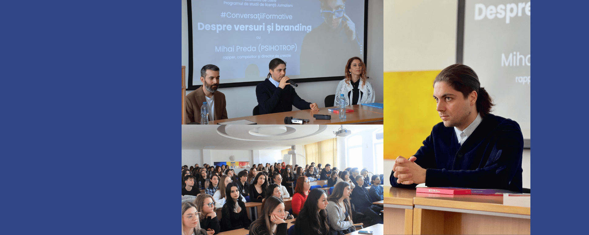 Programul de studii de licenţă JURNALISM din cadrul Facultății de Litere a Universității Ovidius din Constanța (UOC) a organizat, săptămâna trecută, o nouă întâlnire din seria „Conversații formative”, avându-l ca invitat pe Mihai Preda, cunoscut în rândul tinerilor sub numele de Psihotrop. Evenimentul s-a desfășurat în Amfiteatrul Umberto Eco, iar alături de profesorii și studenții de la programul de studii de licență Jurnalism și de la programul de studii masterale Relații publice și dezvoltare interculturală, au fost și studenți de la alte specializări ale Facultății de Litere, de la alte programe ale UOC, precum și elevi de la Liceul Teoretic „Ovidius”, Liceul Teoretic „Traian” din Constanţa și Liceul Tehnologic „Lazăr Edeleanu” din Năvodari. Tinerii au avut astfel prilejul de a-l cunoaște pe rapperul care s-a remarcat prin ideea sa autentică de a transpune operele literare obligatorii pentru examenul de Bacalaureat în piese hip-hop. În contextul evenimentului organizat de echipa de la Ştiinţe ale comunicării UOC, Mihai Preda a intrat în dialog cu lect. univ. dr. Mariana Bafană despre satira din versurile sale și cu lect. univ. dr. Valentin Vanghelescu despre construcția brandului personal.